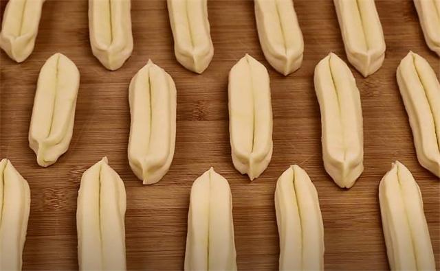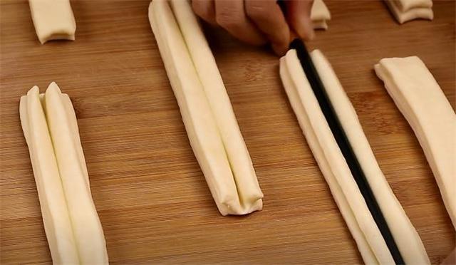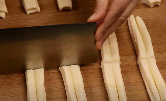 3.再給它切成長條,兩條兩條的摞在一起,用筷子從中間壓一下。