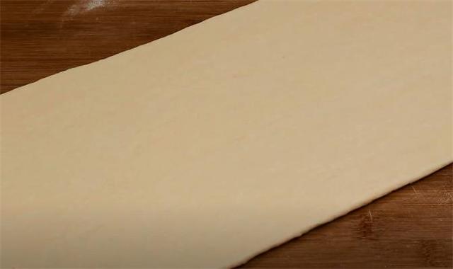 2.醒好之后不要揉,整理成長條,用搟面杖搟成約0.8厘米厚的面片。