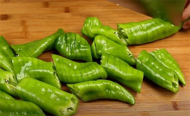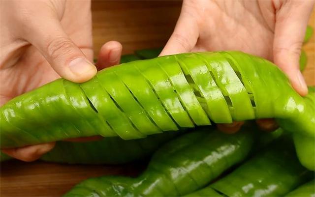 1.先把青椒去蒂,順著一個方向斜刀切下去,不要切斷,全都切成這樣就可以了。