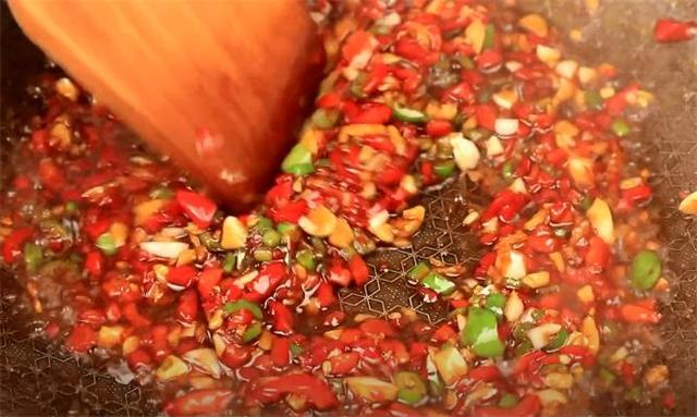 5.起鍋燒油,油熱以后放入青紅椒碎和蒜末,爆香之后加入生抽和素蠔油,稍微翻炒一下出鍋。