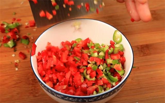 3.下面我們來切一個青椒和一個紅椒,把它切成小碎丁,和蒜末放在一起。