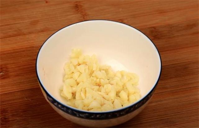 2.接下來把大蒜用刀拍一下,切成蒜末,把切好的蒜末放入碗中備用。