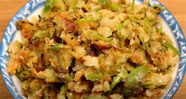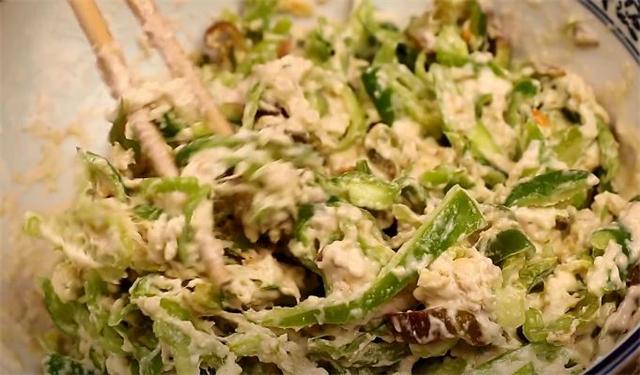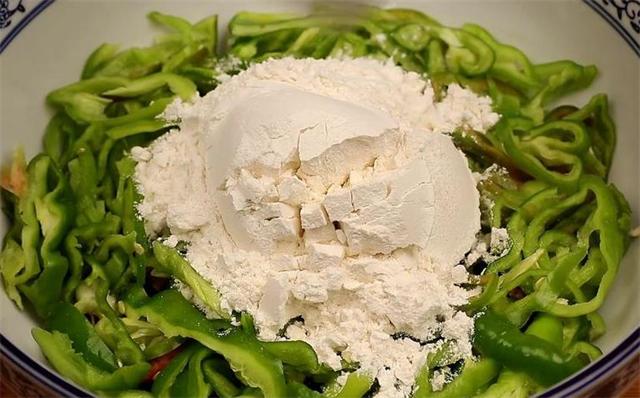準(zhǔn)備食材: 青椒、鹽、十三香、生抽、普通面粉、清水、食用油 具體做法: