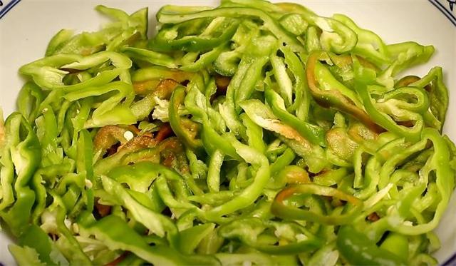 1.我們先把青椒的蒂給去掉,然后給它清洗干凈,青椒洗凈之后切成細(xì)絲,切好之后裝入盆里。