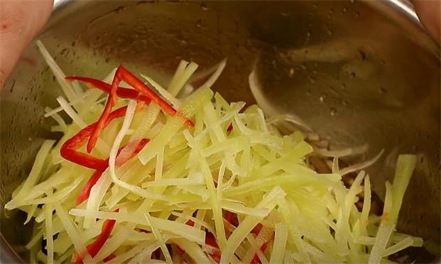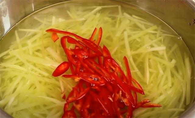 3.準備一個紅椒切絲,也泡到涼白開里面。