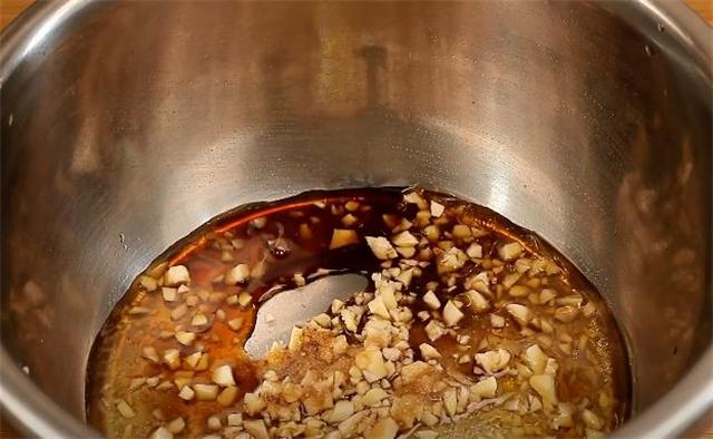 4.準備幾個大蒜切成蒜末,切好放入盆中,加一勺食鹽,一勺白糖,再加入陳醋,加點香油,再加點涼白開,用雙手搖晃均勻。
