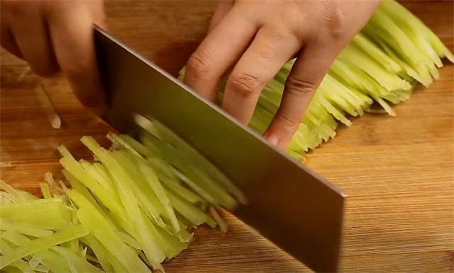 1.把萵筍切成小段后再切成薄片,然后再改刀切成細絲。