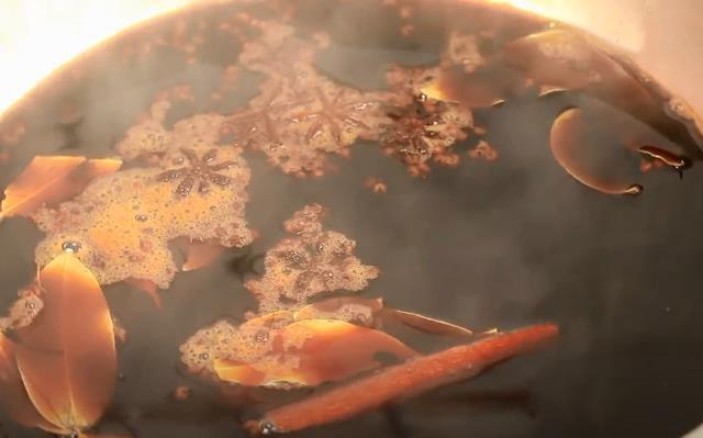2.往鍋里加入生抽,生抽可以多加一點,加入花椒、冰糖、八角、桂皮和香葉,開大火煮開,煮開后再煮3分鐘左右,冰糖化開后關火,然后把料汁放涼。