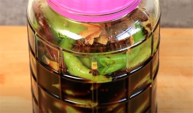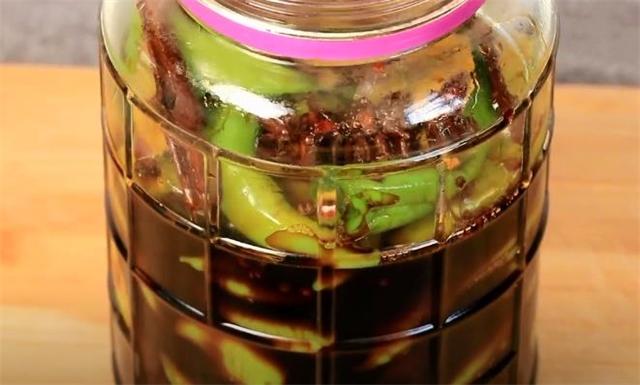 3.找一個干凈無水無油的大瓶子,把青椒放進去,再加入放涼的料汁,把料汁和大料要全部倒進去,把青椒往下壓一壓,讓料汁都沒過青椒。