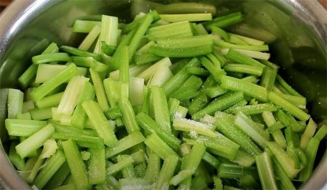 2.芹菜從中間劃開,然后把芹菜再切成小段,切好放入盆中,撒上一勺食鹽,用手抓勻后腌制45分鐘,腌出水分。