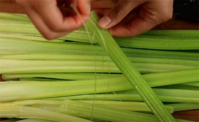 1.先把芹菜的根部去掉,摘掉葉子后清洗干凈,把芹菜中間的筋去掉,這樣口感更好。