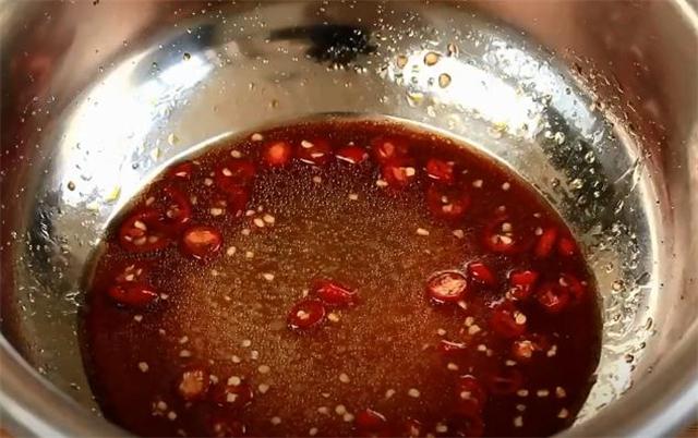 3.準備幾個小米辣切圈,切好后放入盆中,加入食鹽和味精,再少加點白糖,加入白醋和芝麻香油,再加點生抽,用勺子把加入的調料攪勻化開。