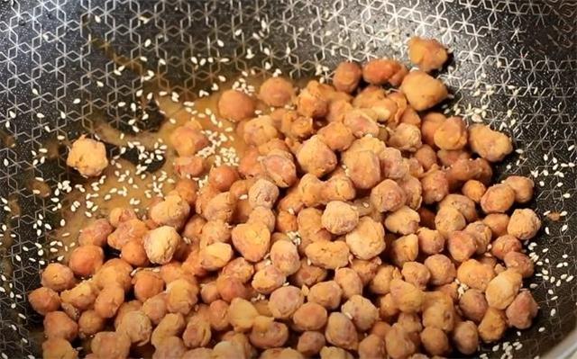 5.鍋里加入一勺清水,再加入一勺白糖,用中小火慢熬,熬成香油色后倒入炸好的花生米,再撒點(diǎn)白芝麻,快速的翻拌均勻。
