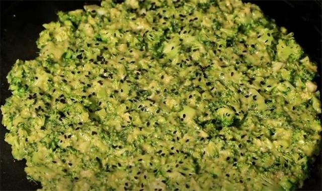 4.電餅鐺預熱后刷點油,用鏟子把西蘭花糊狀抹平,撒上一點黑芝麻,蓋上蓋子燜個2分鐘左右,定型后再翻面烙。