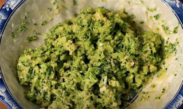 3.往西蘭花里加點食鹽和十三香,再加入適量面粉和清水攪勻,攪拌成這樣的粘稠狀就可以了。