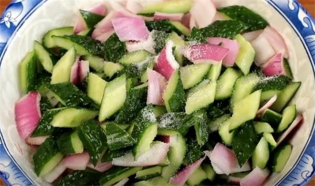 2.少切點洋蔥,切成小塊,和黃瓜放在一起,往里面撒上一點食鹽后攪拌均勻,腌制15分鐘左右。
