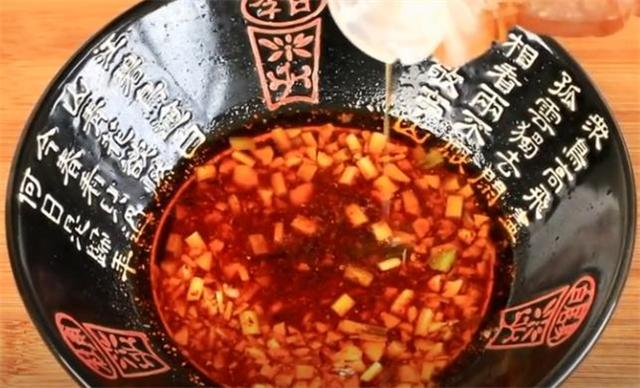 3.準備點大蒜給它拍下,然后剁成蒜末放入碗中,加一勺辣椒面,小半勺花椒粉,再來一勺切好的小香蔥,加入一勺熱油,快速攪拌均勻,把里面的香味激發出來,再加入兩勺生抽,三勺陳醋,加少許白糖,再加點香油,用筷子拌勻。