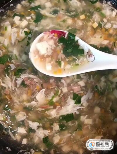 最后用水淀粉勾芡一下,淋入一個雞蛋的蛋清,滴幾滴香油,攪拌均勻