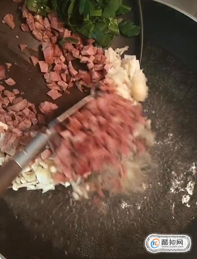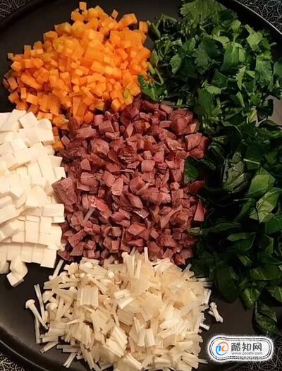 首先,我們將熟牛肉,豆腐,菠菜,金針菇,香菜分別切丁備用