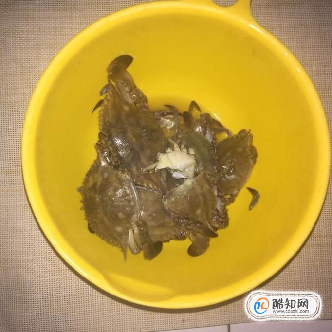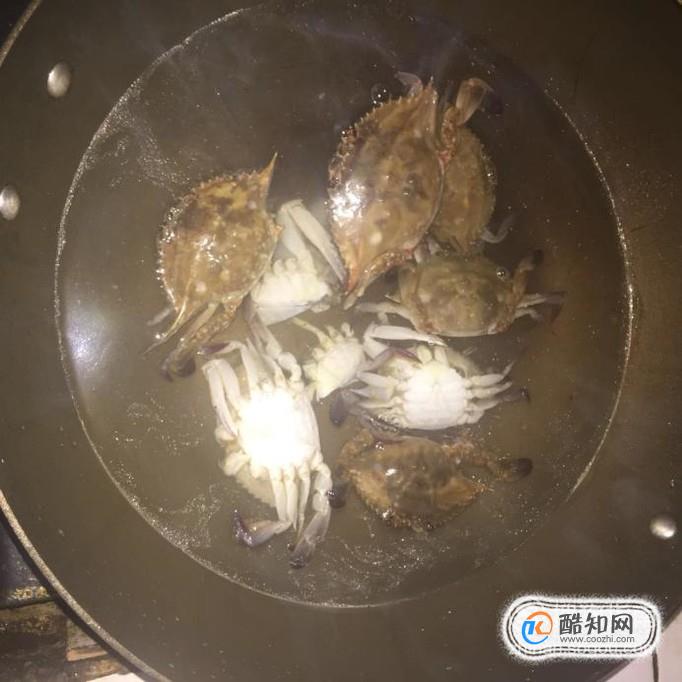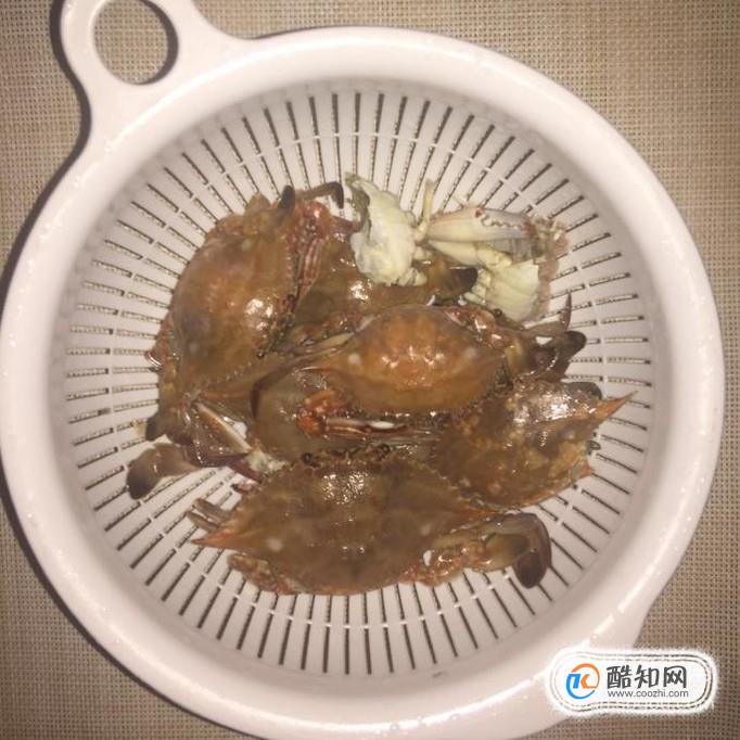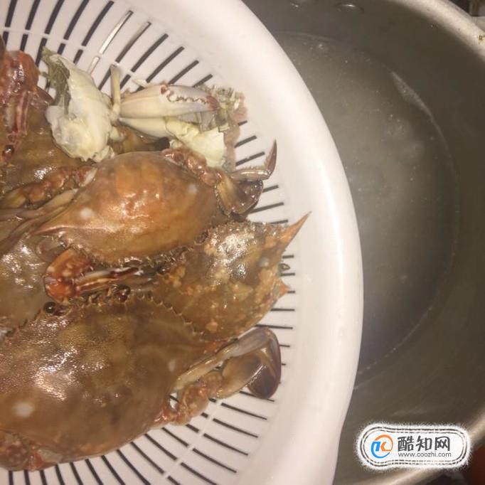 然后把處理好的螃蟹對半切開,鍋中放入適量的清水,待水燒開,倒入螃蟹燙5分鐘,撈出瀝干。