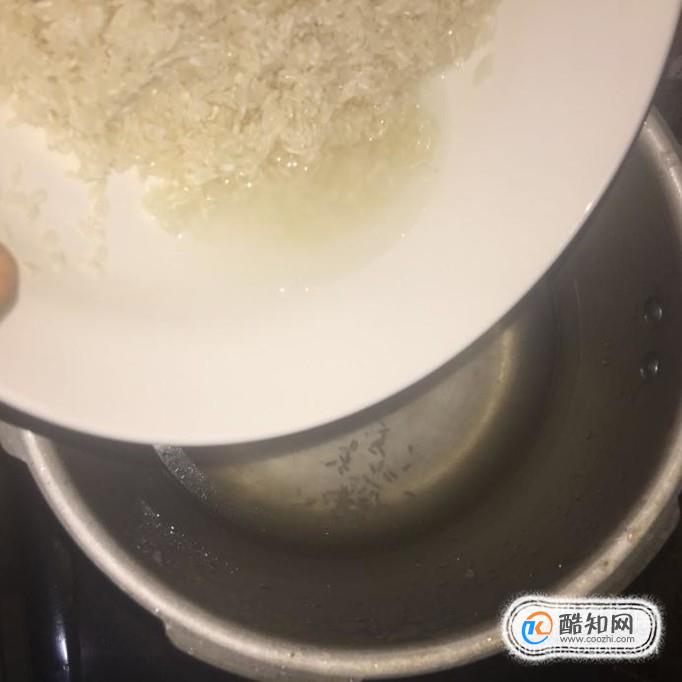 接著往高壓鍋中加入適量的清水,倒入泡好的大米。