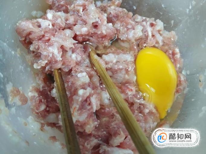 取一個雞蛋,然后敲到之前做的餡料中,用筷子拌勻。