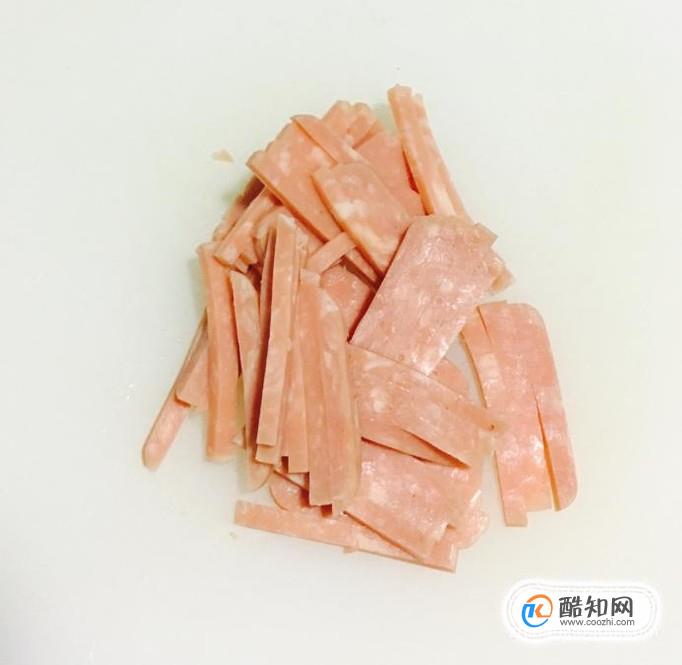 蔥清洗干凈切成蔥花,方火腿切粗絲備好