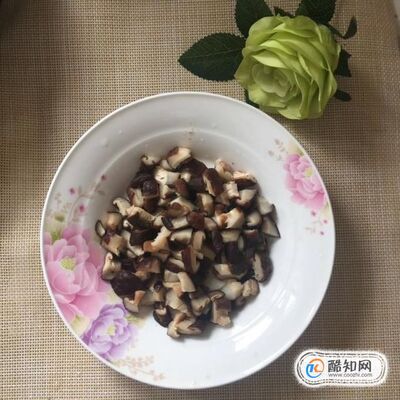 然后把泡好的香菇切成丁,倒入電飯煲,如下圖所示。