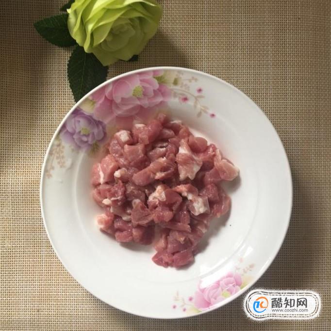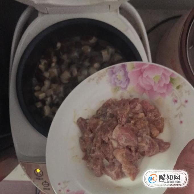 接著把瘦肉切成丁并用適量的地瓜粉裹一下,倒入電飯煲。設定好煮粥模式就可以了。