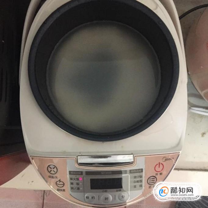 接著把泡好的大米,加入適量的清水,放入電飯煲煮五分鐘。
