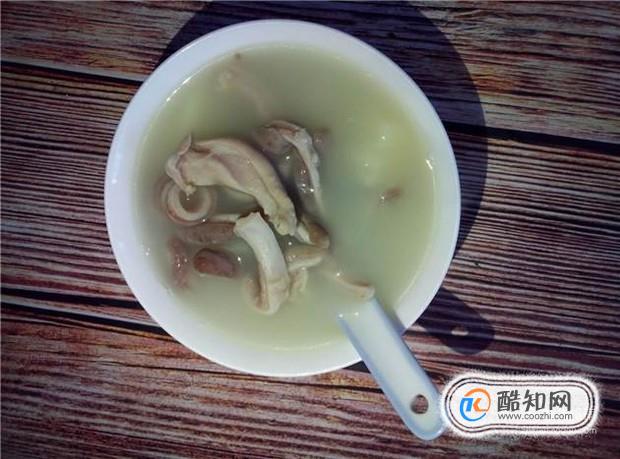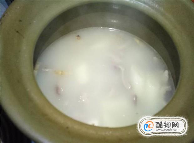 大火燒開后,轉小火慢慢燉,知道把豬肚的味道給燉出來,湯變成乳白色。 -