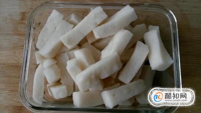 首先把年糕從冰箱取出來,切成厚度均勻的薄片備用。