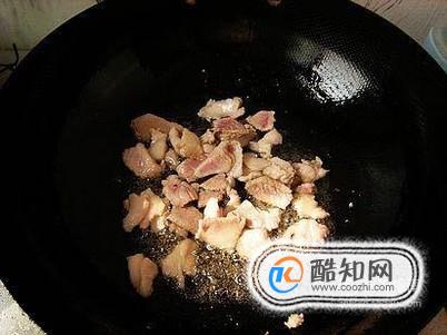 鍋中倒入適量油,等到油熱,倒入腌制好的肉絲翻炒,變色后盛起。