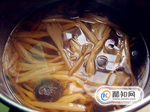 如果我們做的是香菇湯的話就加入生姜,香菇,黃花等材料進去,然后倒入適當的涼水,再放入我們的瘦肉。