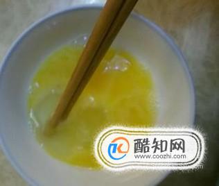 選擇兩個雞蛋,去殼放于碗中,放一點鹽,用筷子攪拌至蛋黃與蛋清混合均勻。