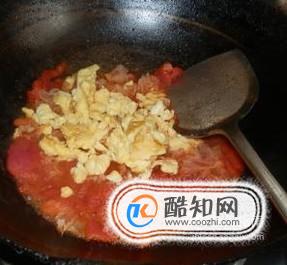 鍋中加油少許,5分熱時,加入雞蛋煎制,然后我們加入切好的西紅柿,翻炒一分鐘。