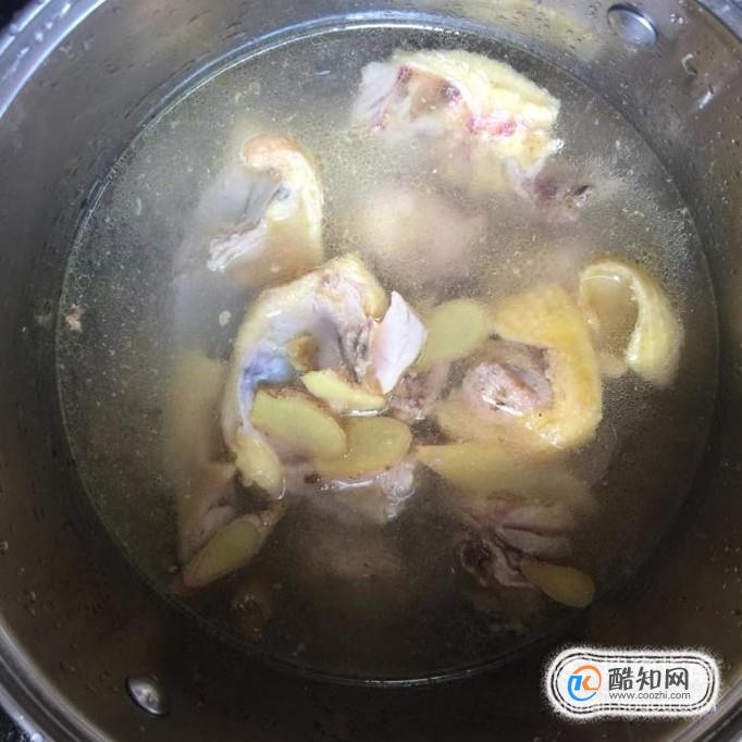 接著往湯鍋中加入適量的清水,待水燒開,倒入雞肉煮到沸騰。