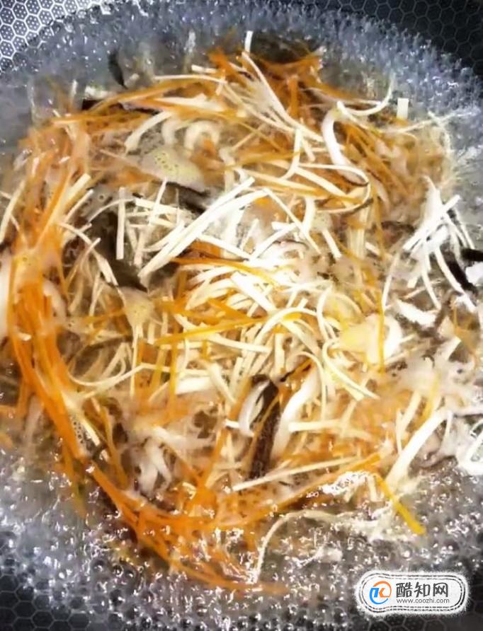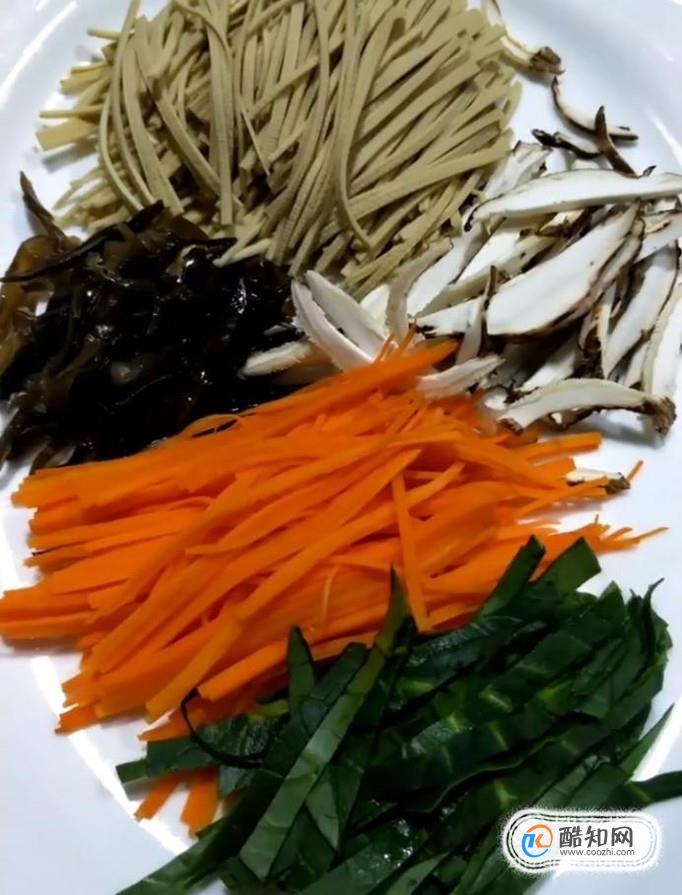 首先我們先準備一下配菜:豆腐皮,木耳,胡蘿卜,香菇,青菜,分別切絲備用