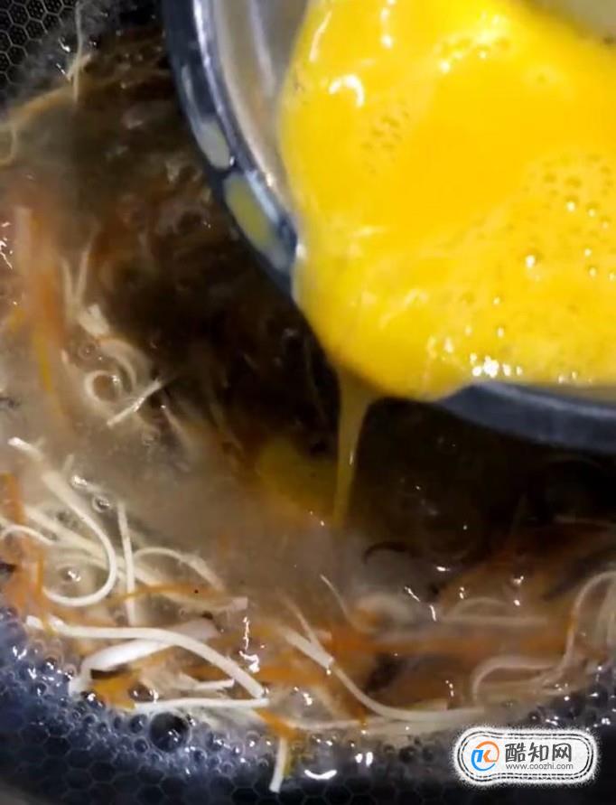 然后我們將雞蛋打散,攪拌均勻,倒入鍋中,煮兩分鐘