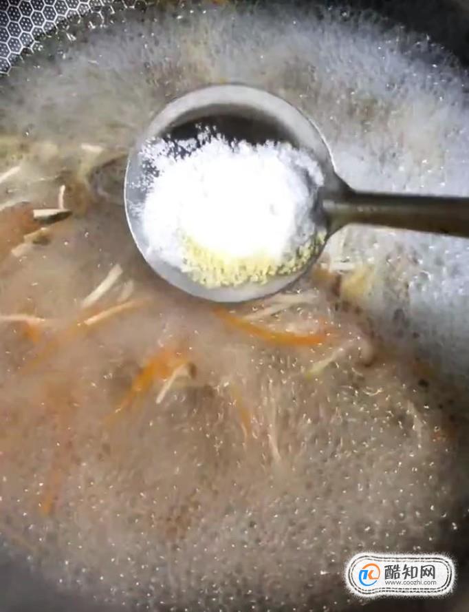 接著我們放入適量的鹽,雞精,用來調味,倒入水淀粉勾芡一下