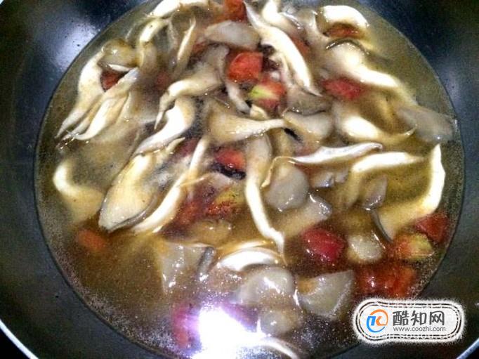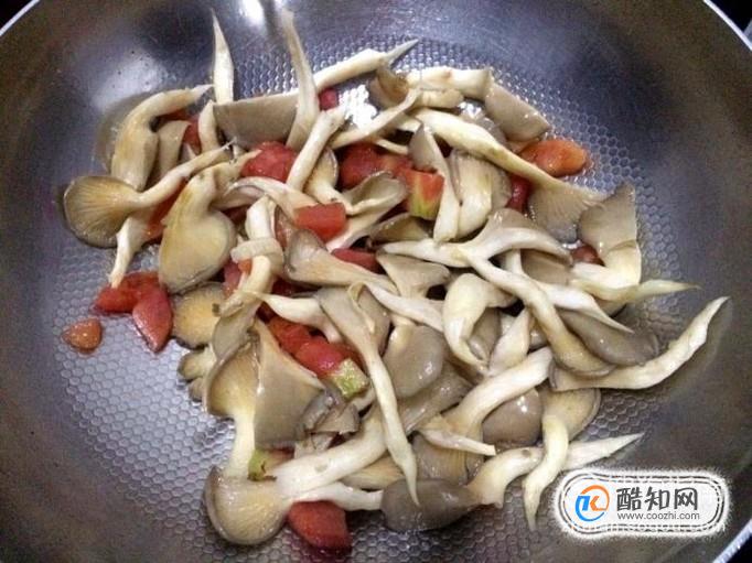 起鍋燒熱,下豬油,油化后下西紅柿、蘑菇翻炒均勻。