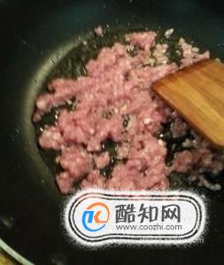 然后加入肉末,翻炒至黃金色,肉末熟透,切記不要糊了。