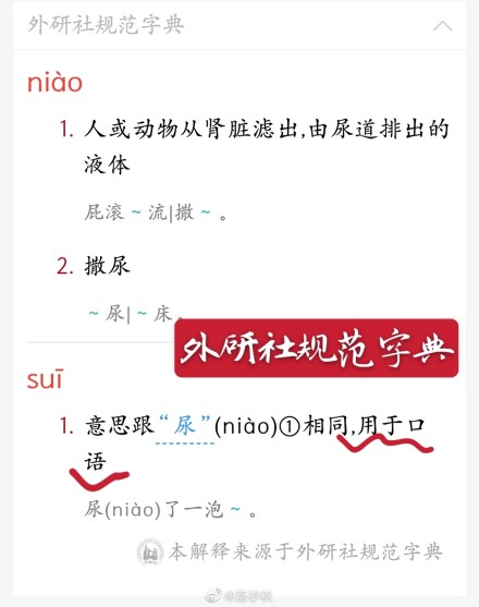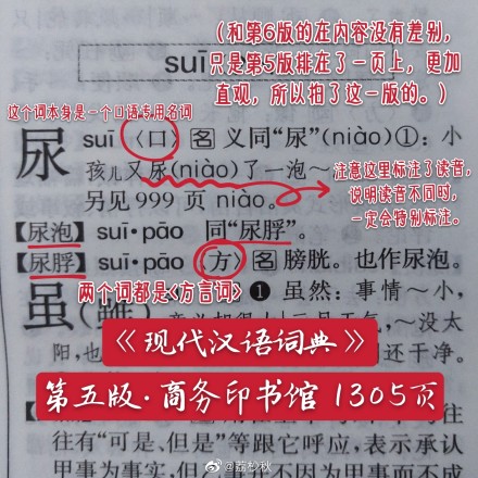 最近在網上很多人都在討論這個尿尿兩個字的讀音要怎么讀,有的人就問了啊,這不就讀尿尿嗎?有什么問題嗎?其實如果你是北方人這樣讀好像沒有問題,但是如果你是南方人這個就是個問題,因為好像有人讀這個尿尿讀“niào suī”啊?那么到底是一種什么樣的讀音呢?下面我們一起來分析看看! ![]() 其實北方人讀尿尿為“niào niào”,南方人讀“niào suī”也不見得都是那樣的,這個不能作為正常答案,正確的答案是一般人都讀“niào niào”,但是有的地方方言是讀“niào suī”的,所以讀“niào niào”,讀“niào suī”都一點問題沒有的,都是對的。 ![]() 微博荔杪秋博主分析 作為一個學語言的,我對語言相關的熱搜極為敏感。抱著懷疑的態度,我剛剛查了一下。 先說個人結論:我認為niào suī是方言或口語(廣義的現代漢語)的合理讀法,并不是普通話(狹義的現代漢語)的標準讀法。 我查了《現代漢語詞典》第五版和第六版、網頁版《新華字典》和詞典APP(內容來自外研社規范字典)。具體圖片都放在下面了。 在《現代漢語詞典》的解釋里,suī是口語用詞,而且只能充當名詞,和suī相關的詞語皆為方言用詞。而niào可以做名詞和動詞,參考在為suī舉例時,字典特地將動詞的讀音標注為niào,我認為可以得出結論,關于“尿尿”,suī并不是后者的唯一讀音。 而《新華字典》則索性直接在詳解里把suī判定為方言。外研社規范字典里標明suī是口語用法。 所以,從我目前查到的資料來看,大張旗鼓地宣揚niào suī才是“尿尿”的正確讀音的博主,恐怕有利用大眾獵奇心態隨意“科普”之嫌。 雖然我們保護現代漢語方言,但也一直在大力推廣普通話。因此我認為,讀成niào suī是可以的,但讀成niào niào 是完全沒有問題的,甚至以我個人拙見,后者反而是應該被推廣的。 歡迎一切有理有據的討論。 ![]() ![]() ![]()
