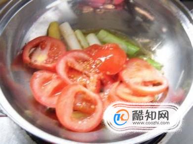蔣番茄切成一片一片的,將蔥切成一段一段的,把豬油炒化后倒入番茄和蔥翻炒