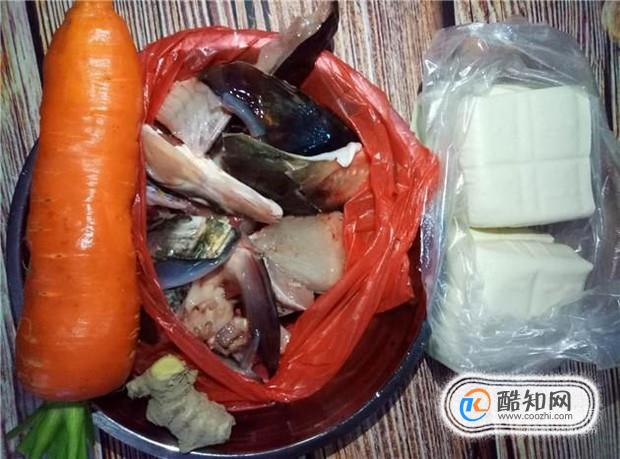準備好所有材料:魚頭兩塊、紅蘿卜一根、豆腐四塊、姜適量