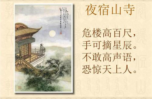 “危樓高百尺,手可摘星辰”,出自李白的《夜宿山寺》。意思是“山上寺院的高樓真高啊,好像有一百尺的樣子,人在樓上好像一伸手就可以摘下天上的星星”。