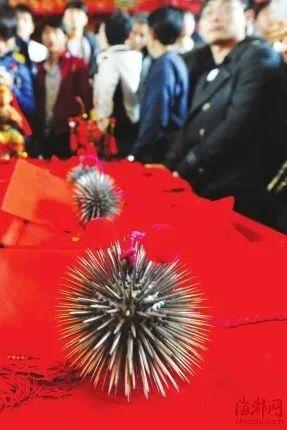 @新華社記者 張國俊 攝 每年的正月,莆田涵江區鎮前、下灣頭、七步等自然村都會舉行“錐球刺身”的游神祭祀活動。以表達對祖先烈士的敬意。 海膽狀的鐵球直徑約十厘米,上面布滿尖刺。