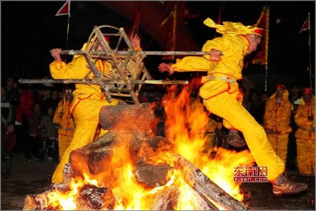 @海都網 而元宵抬棕轎是莆田多地鬧元宵的傳統習俗。在空地上用木柴圍起一個圈,點燃后,選年青力壯的男性赤腳抬著菩薩座轎穿越火海而過,表達民眾希望祈福驅邪、家家興旺的愿望。