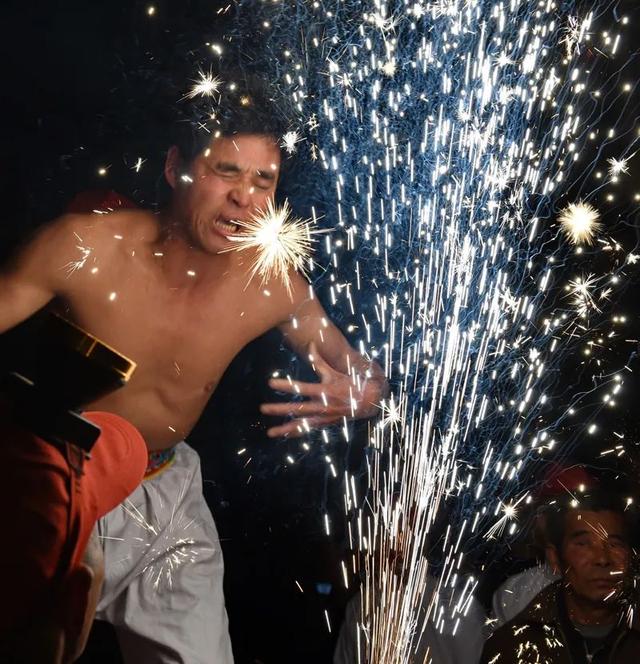 @晉江新聞網 莆田 莆田“吃花”,是一種古老的儀式。夜幕之下,乩童赤膊將身體伸進燃放的煙花中。火星飛濺,極富有觀賞性。吃花活動每年在涵江芳山上演。